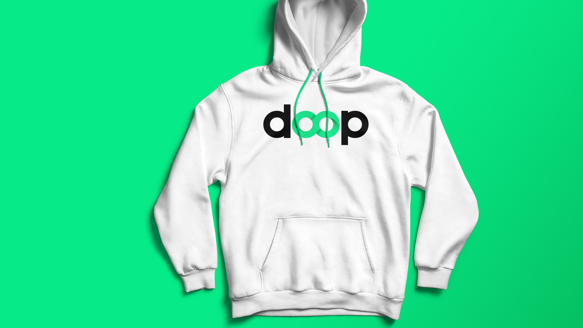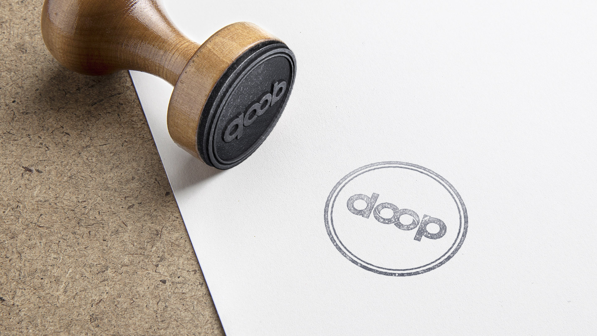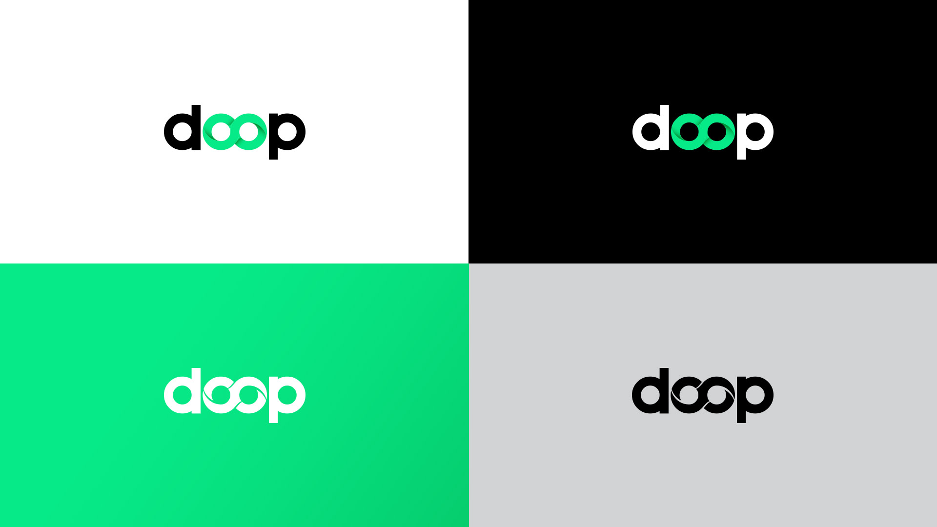 Doop é a junção das palavras deep (profundo) e loop. O ícone que faz parte do logotipo representa este conceito: um loop infinito. Para fixar ainda mais a ideia, desenvolvemos uma marca que pode ser vista rotacionada com exatamente a mesma aparência.