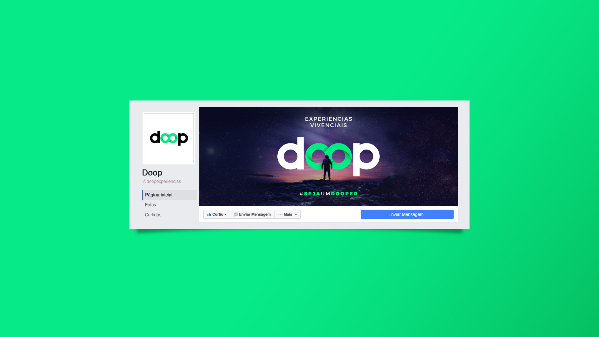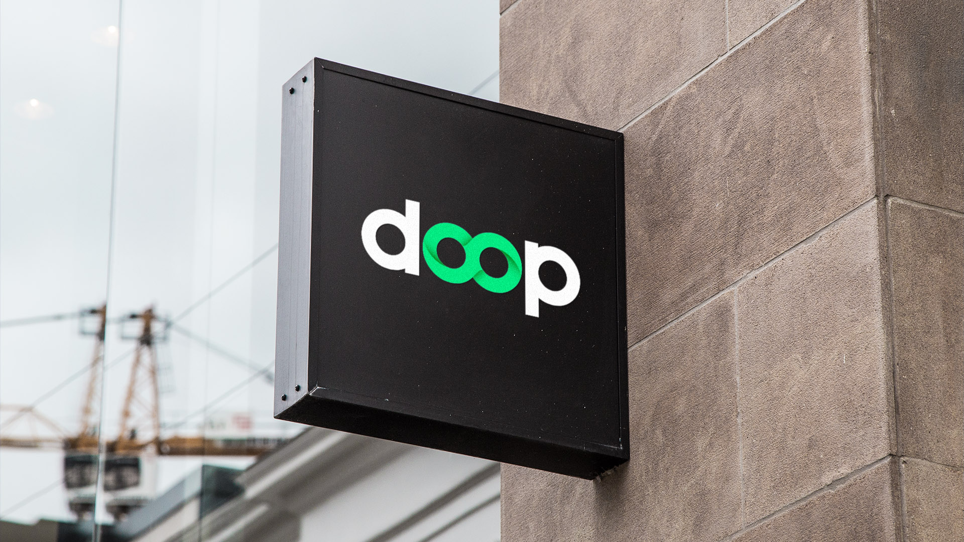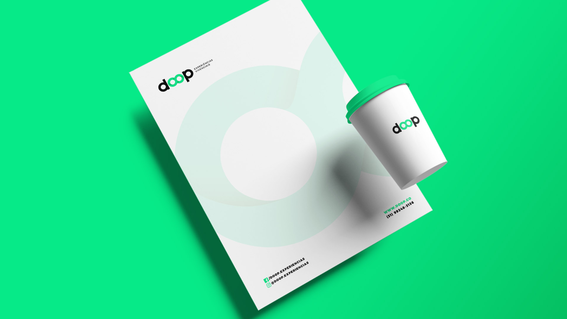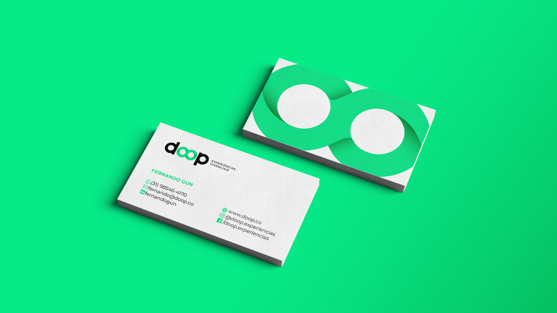 Doop é a junção das palavras deep (profundo) e loop. O ícone que faz parte do logotipo representa este conceito: um loop infinito. Para fixar ainda mais a ideia, desenvolvemos uma marca que pode ser vista rotacionada com exatamente a mesma aparência.